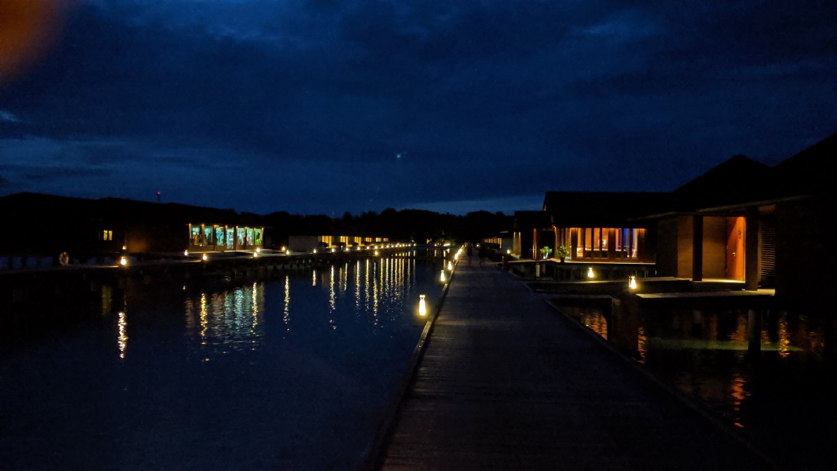 After a heady dinner, we were all in a reflective mood. We sauntered along at snail’s pace to our Water Villas. The entire stretch was connected by wooden walkways. We reached one of the villas and just sat down on the walkway with our feet dangling over the water.