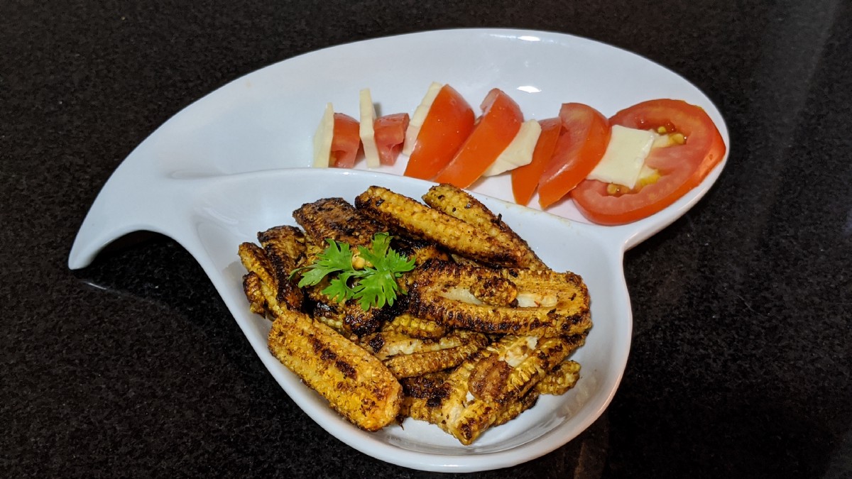 Stir-fried baby corn with a side of tomato slices and cheese.