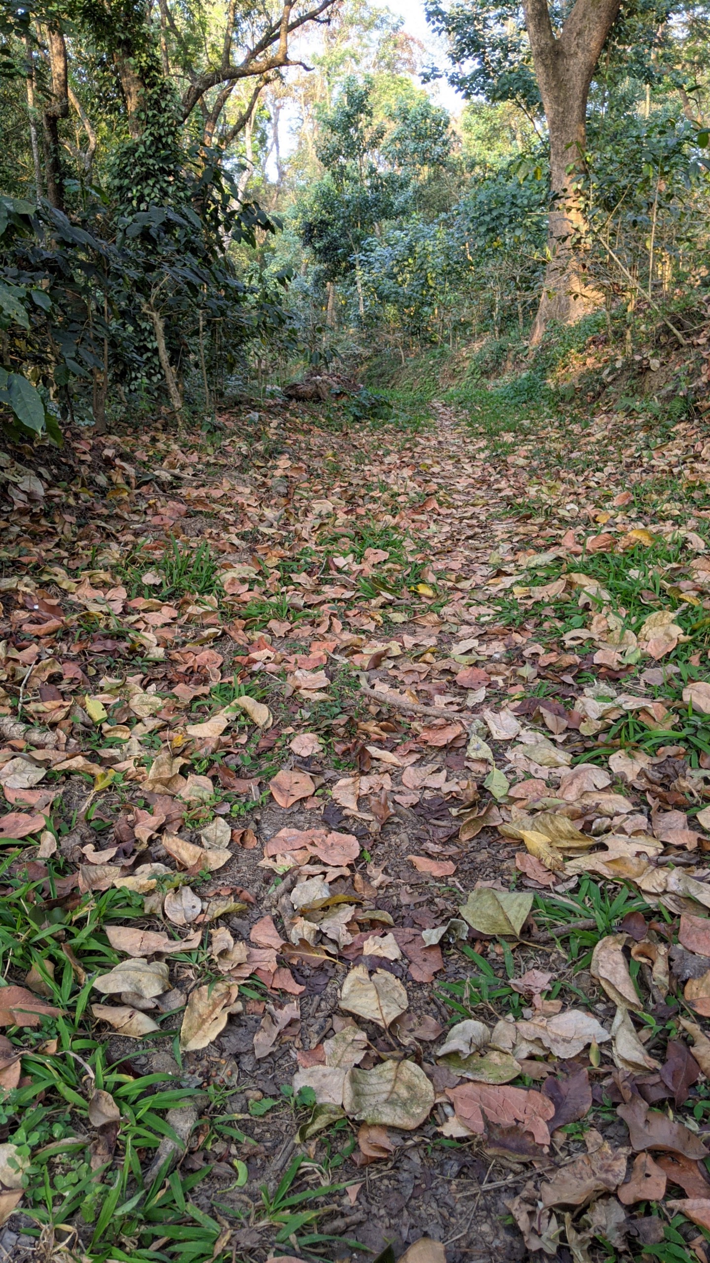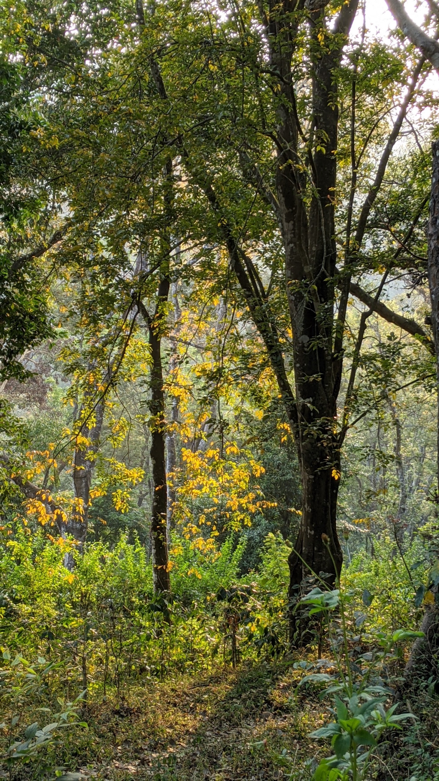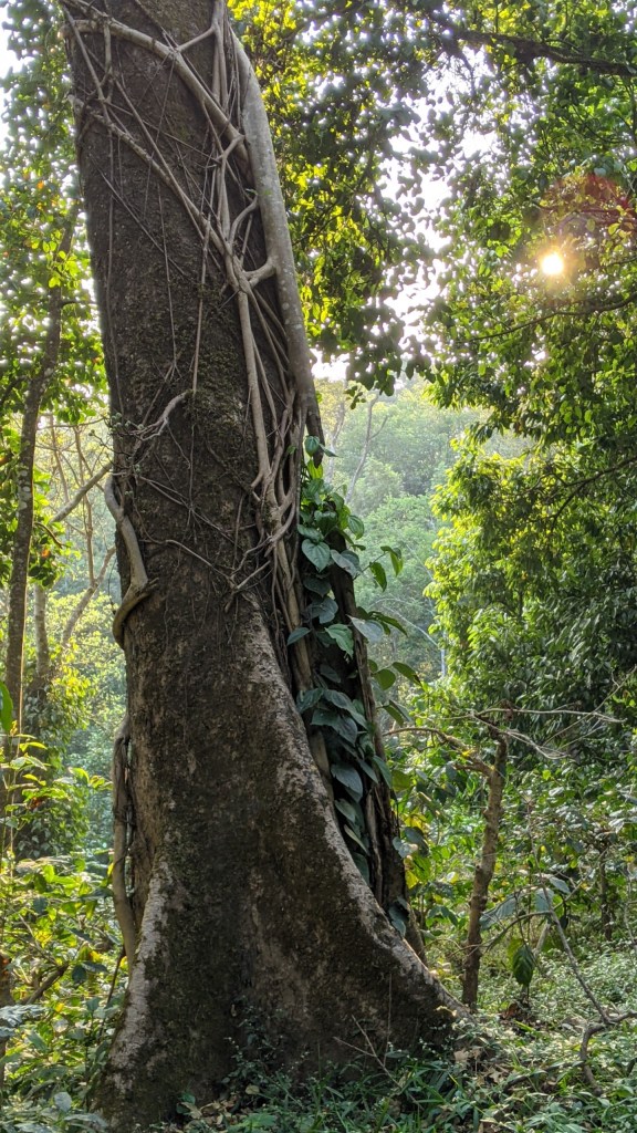 Oh, and what can be said about the play of light! I felt giddy with excitement to be treated to such a sight. The Sun seemed in such a benevolent mood. By the mere act of getting off my butt and walking down that path, I was suddenly privy to a party with green and yellow disco lights. The music — a heady cocktail of birdsong by a thousand unseen birds. We craned our necks and held our breath to try and spot some. We got super lucky. We spotted and managed to recognize the Indian Gray Hornbill and thought we saw a Malabar Whistling Thrush.