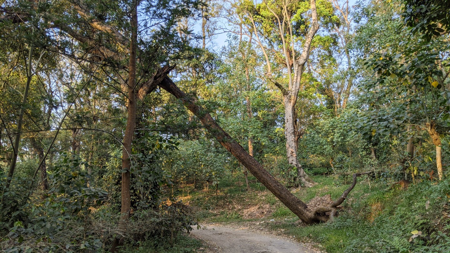 What is that quote about a tree falling in a forest? Does anyone care? Maybe no one outside, but the forest sure cares. Look at the fallen tree in the picture! See how beautifully it is supported by the other one. My friend and I talked about how the tree continues to live because its neighborhood is so loving and giving. It was worth standing there and watching the whole symbiosis that was at play quietly without any show or fuss.