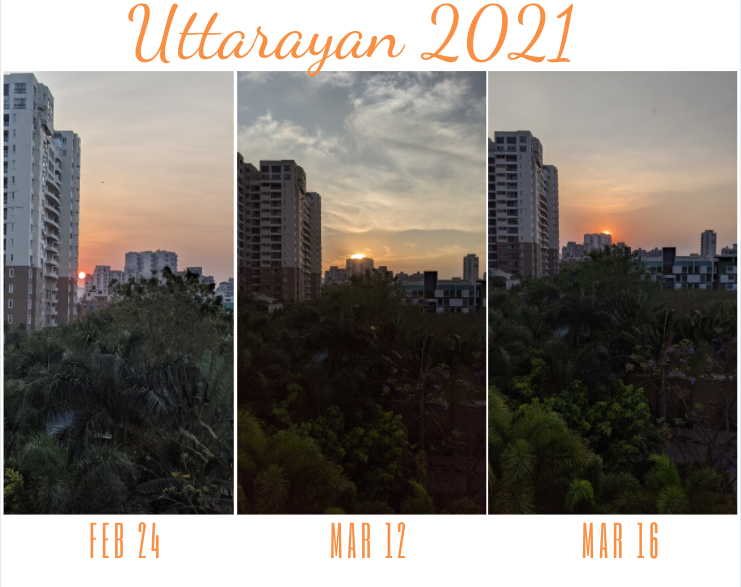 The best part? I seem to have clicked the pictures at approximately the same time each day. 6:13 pm, 6:07 pm, and 6:06 pm, to be precise. The Sun showed up each day and moved just a little bit in the journey towards the north.