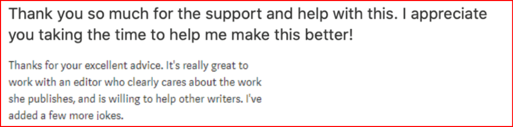 Collecting goodwill. MuddyUm writers are all very talented. Mudditors help polish up the work just that little bit, for which most writers are thankful. We collect the goodwill of our writers. Believe me, it is huge. Goodwill can work magic. Some writer comments below: